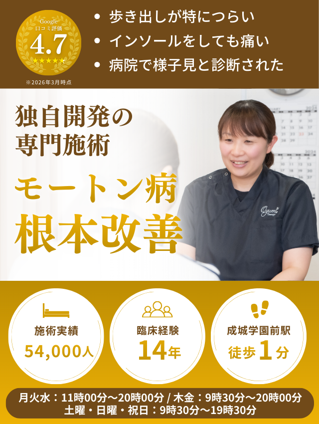 当院は、局所のマッサージだけでなく、足裏のアーチの調整を行います。膝関節・股関節・骨盤の調整も行い、つま先に重心が集まりにくい体作りをご提供します。モートン病でお悩みの、あなたの「最後の砦」になります!お1人で悩まず一度当院までご相談ください。